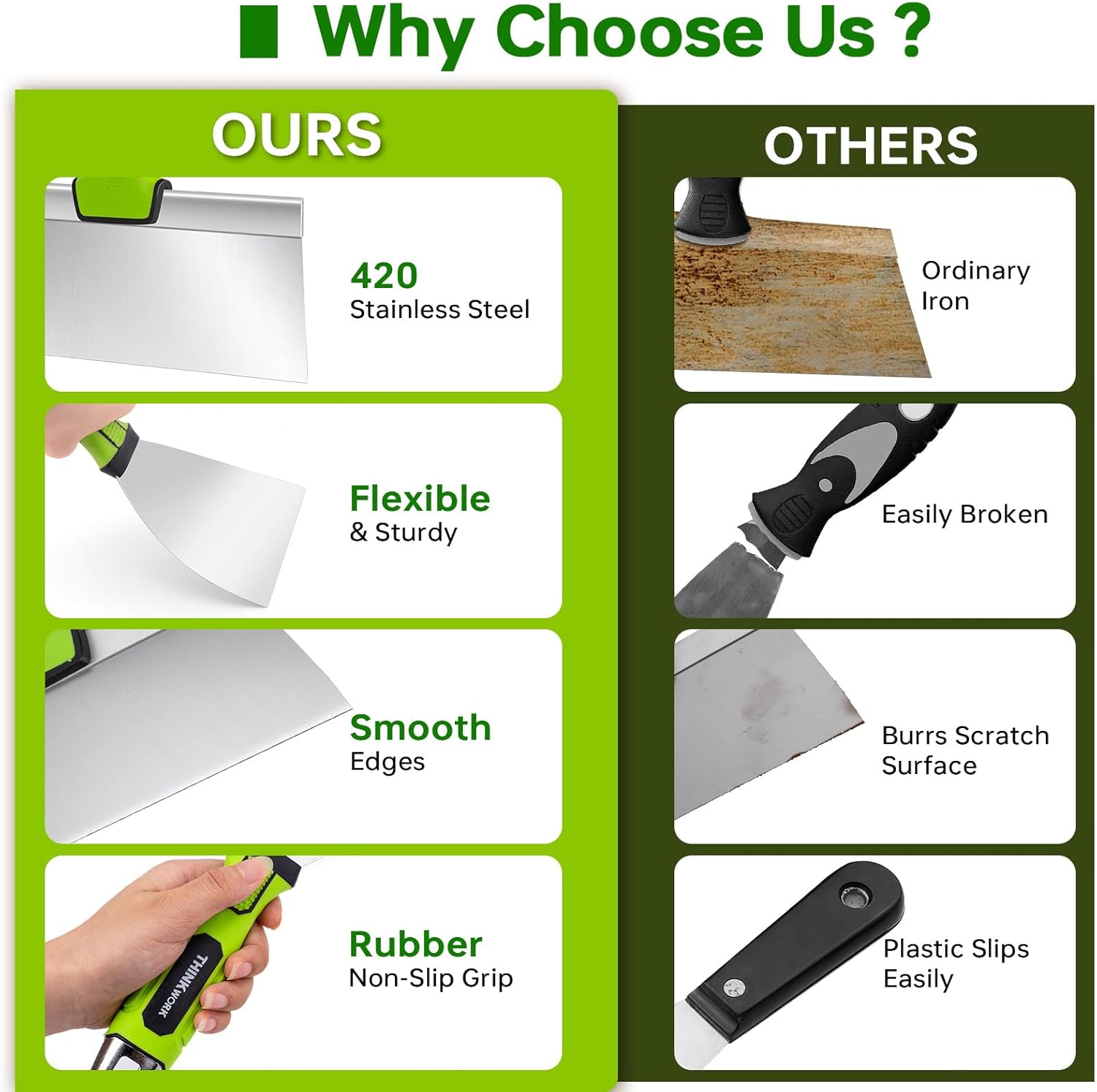 | Included Components | 4 x Putty Knife (1, 2, 4, 6 inch), 2 x Taping Knife (8, 10 inch), 1 x Multi-Purpose Painter’s Tool, 1 x 10" Mud Pan |